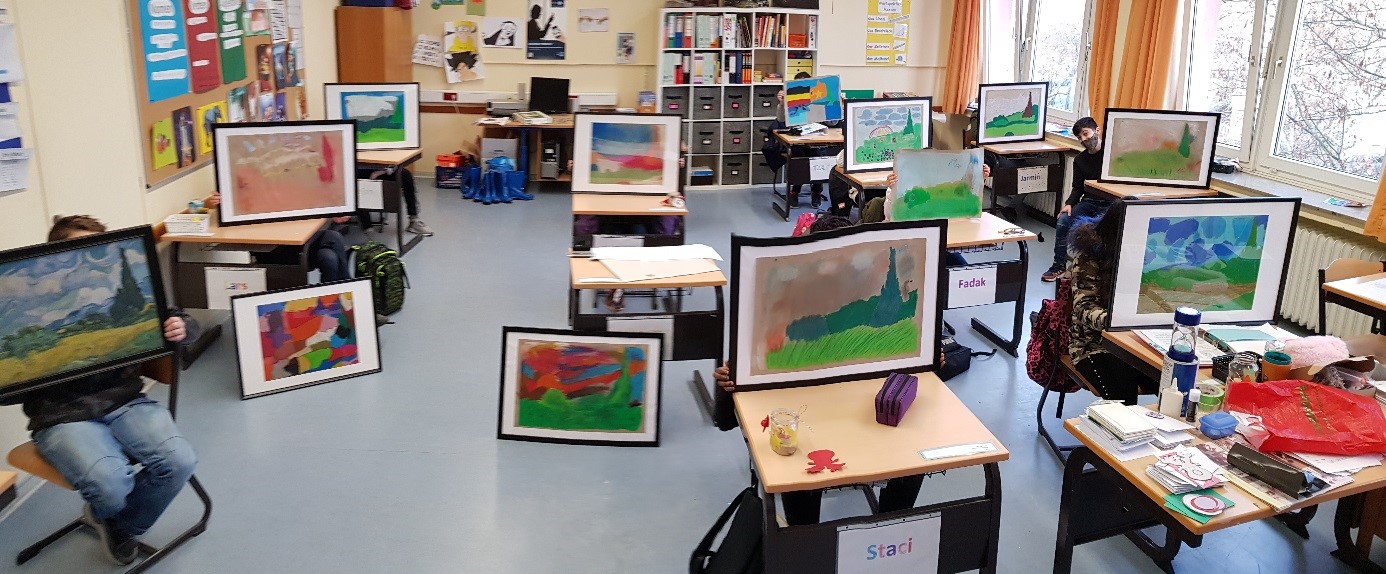 Die Klasse M5 ging in Vorlage und so hat jeder Schüler/jede Schülerin das Gemälde neu gestaltet. Zum Einsatz kamen Pastell- und Ölkreide. Es entstanden wundervolle neue Kunstwerke. Und jeder/jede konnte in seinem/ihrem Stil gestalten.